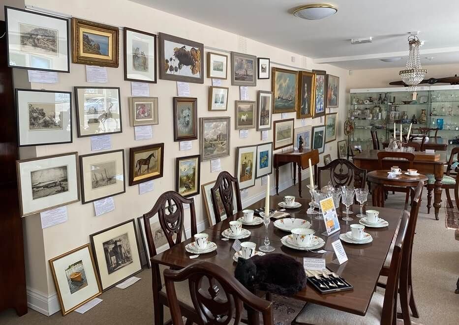 We have a gallery section with oils, watercolours and prints plus some exquisite 19th Century material including an English Paisley Shawl in perfect condition.